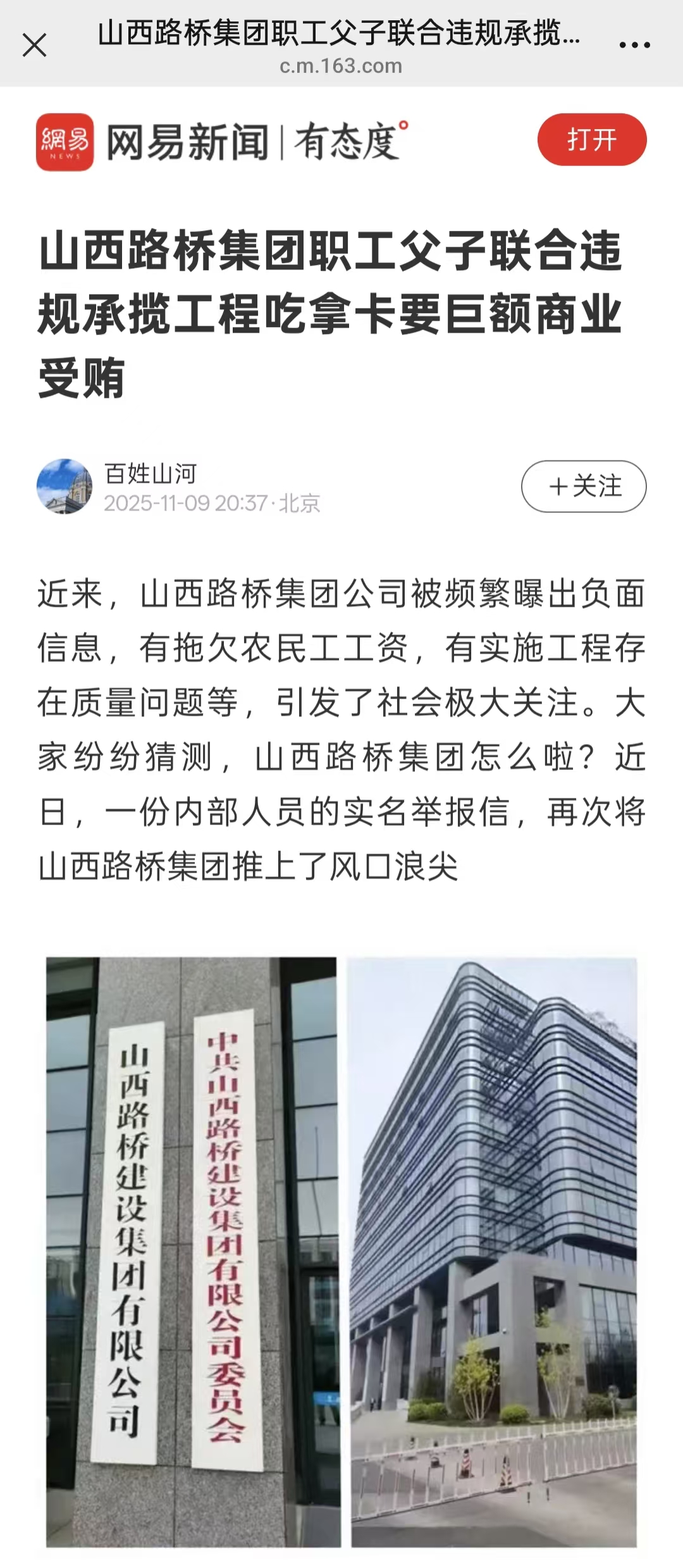 来源:网易@百姓山河 2025/11/10 11:10:59近来,山西路桥集团公司被频繁曝出负面信息,有拖欠农民工工资,有实施工程存在质量问题等,引发了社会极大关注。大家纷纷猜测,山西路桥集团怎么啦?近日,一份内部人员的实名举报信,再次将山西路桥集团推上了风口浪尖。