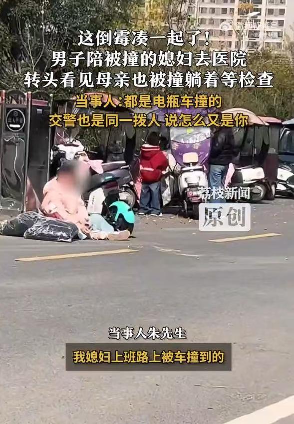 近日,安徽阜阳,朱先生陪被撞的媳妇去医院,转头看见母亲也在医院,因被撞躺着等检查。朱先生告诉@荔枝新闻 记者,媳妇上班路上被车撞到了,拍CT时碰见母亲。母亲带孩子从商场出来时被车撞到,都是被电瓶车撞的,处理的交警是同一拨人,说怎么又是你。媳妇是胳膊肘受伤,母亲严重一点。