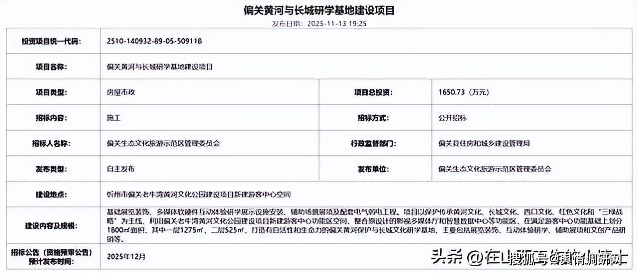 近日,“偏关黄河与长城研学基地建设项目”发布招标计划,总投资约1650万元,地点锁定在老牛湾黄河文化公园新建游客中心,规划面积1800平方米。