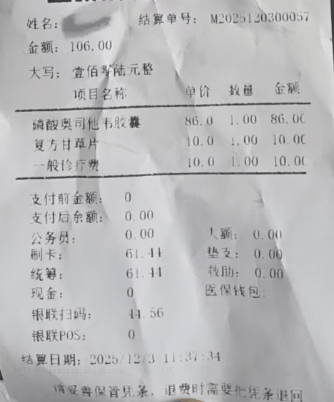 12月3日,重庆酉阳县,毛先生向潇湘晨报记者反映,他女儿最近感染了甲流,回老家养病,他去车田乡卫生院给女儿买药,卫生院开了“奥司他韦”,收了他86块钱。他找做医生的朋友一打听,朋友说这种药只要三十块钱,他上网一搜,更有商家只卖9块钱。他去问医院,医院说他们是从内部平台采购的,平台什么价他们就卖什么价。